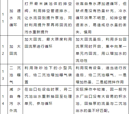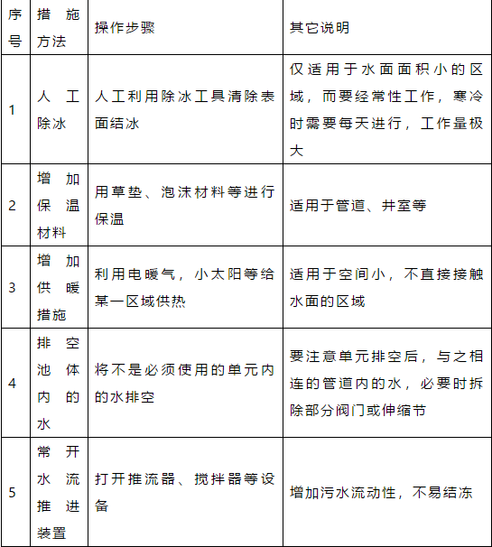 1、環境溫度降低至零度以下,厭氧、好氧系統的溫度可能會相應降低,但對系統的處理能力影響有限。若確實有影響,對于厭氧系統,可以通過提高進水水溫的方法來解決(但是,厭氧反應器的最高溫度不宜超過38.5℃),對于好氧系統,可以通過稍稍提高污泥濃度,或者提高溶解氧的方式解決。