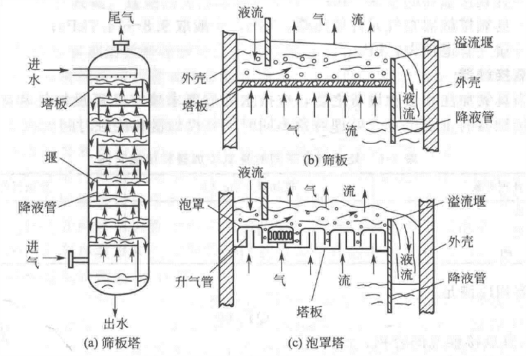 如上圖所示,塔內每50-70mm設一層塔板,每層塔上設溢流堰和降液管,液體在塔板上翻過溢流堰,經降液管流到下層塔板。